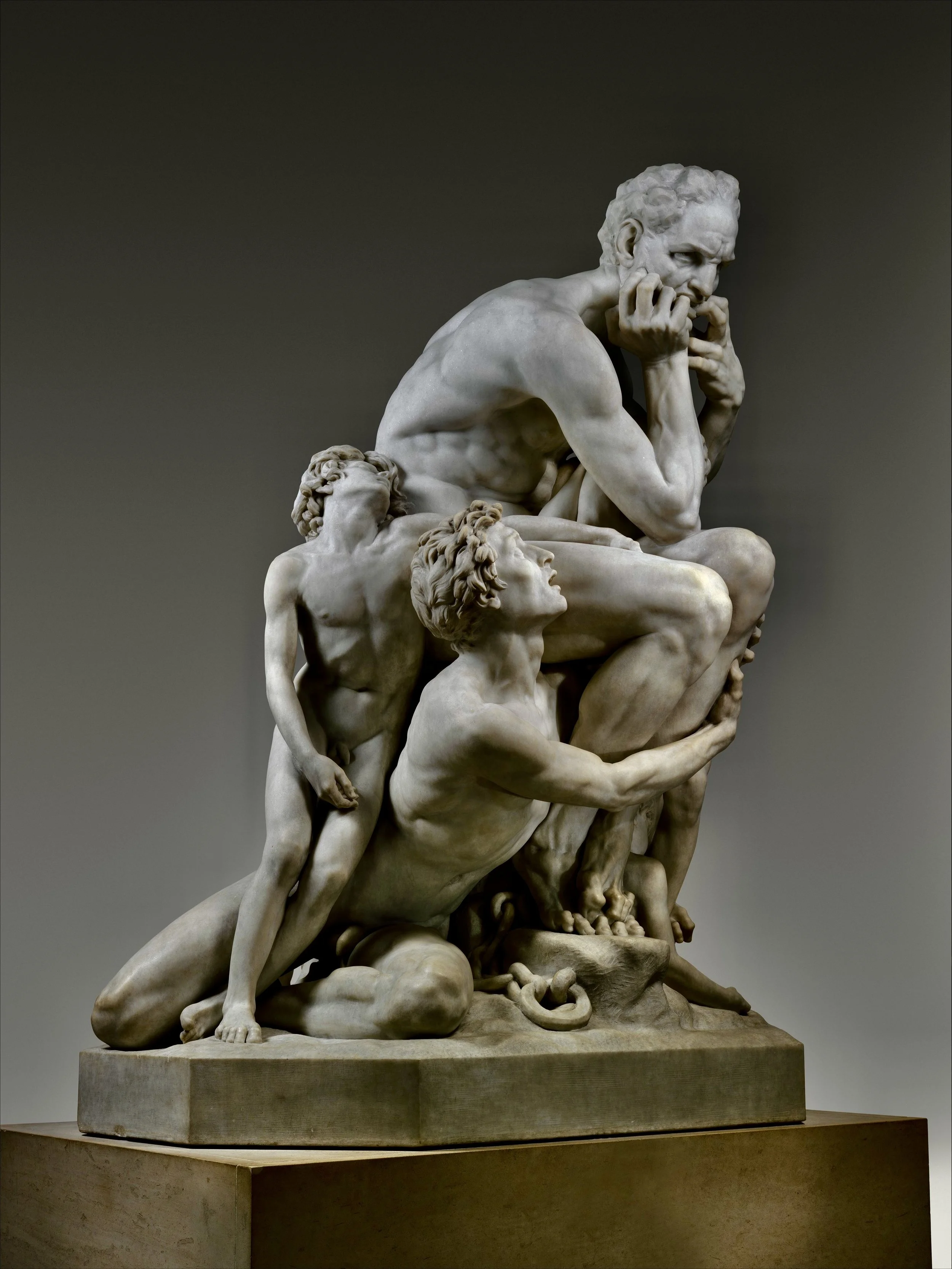 In mid-nineteenth-century, Jean-Baptiste Carpeaux broke away from traditional approaches, shifting to a freer and more naturalistic style. Biographically, his life encompassed a volatile mix of raw talent and rawer ambition, incessant work, grasping parents, a tormented marriage, economic struggle, debilitating illness and some Othello-like paranoia. And his sculptures expressed a previously unseen freedom and immediacy. The subject of this intensely Romantic work, Ugolino and his sons, is derived from Dante's Inferno, which describes how the Count Ugolino, his sons, and his grandsons were imprisoned in 1288 and died of starvation. "Ugolino and His Sons" depicts a father imprisoned with his starving children, his gaze averted as they hold desperately, embodying fractured family bonds under extreme duress where survival instincts erode connection. Ugolino, looking into the distance, is gripped by the agonizing death of his grandchildren and son, as his other son clings to his body.