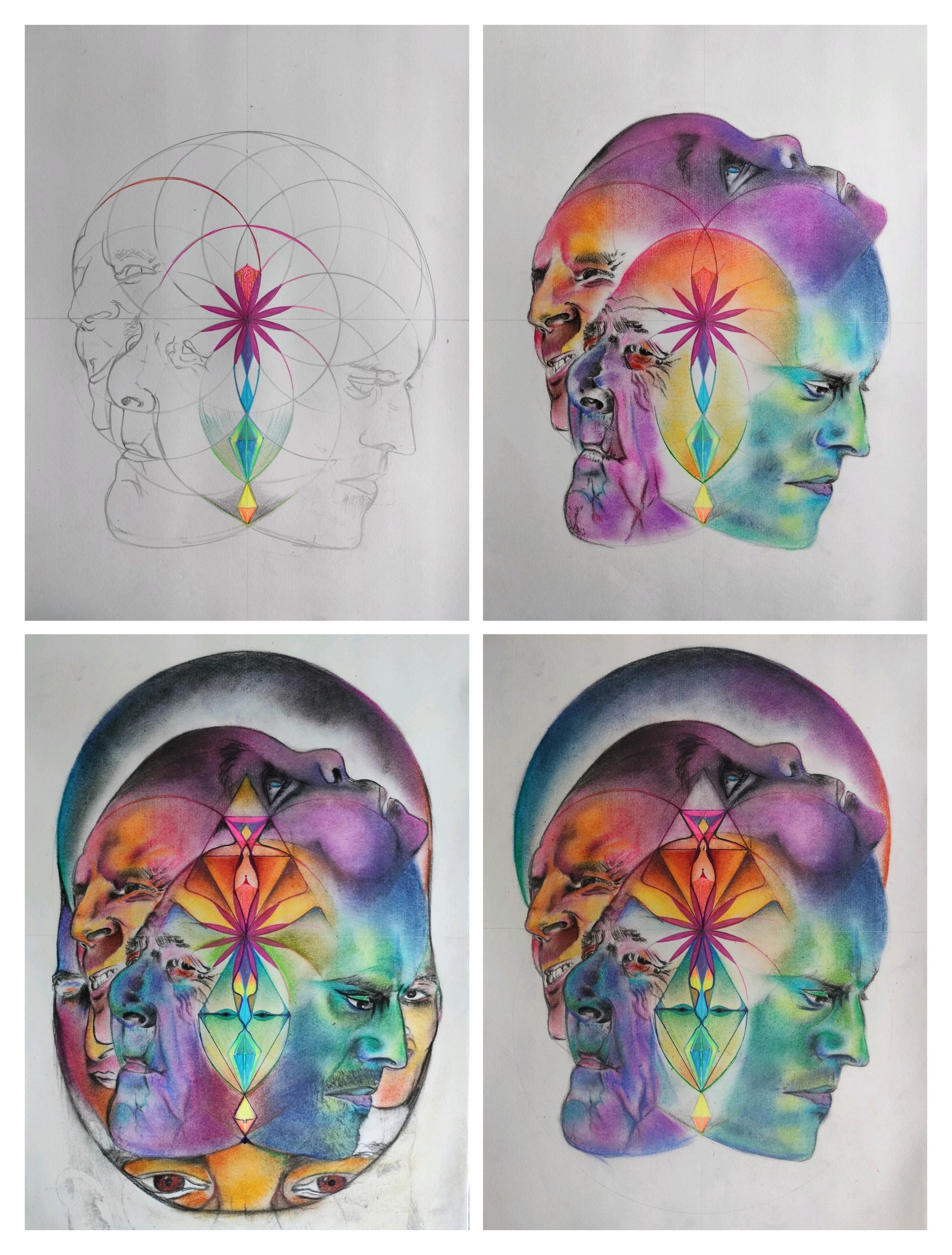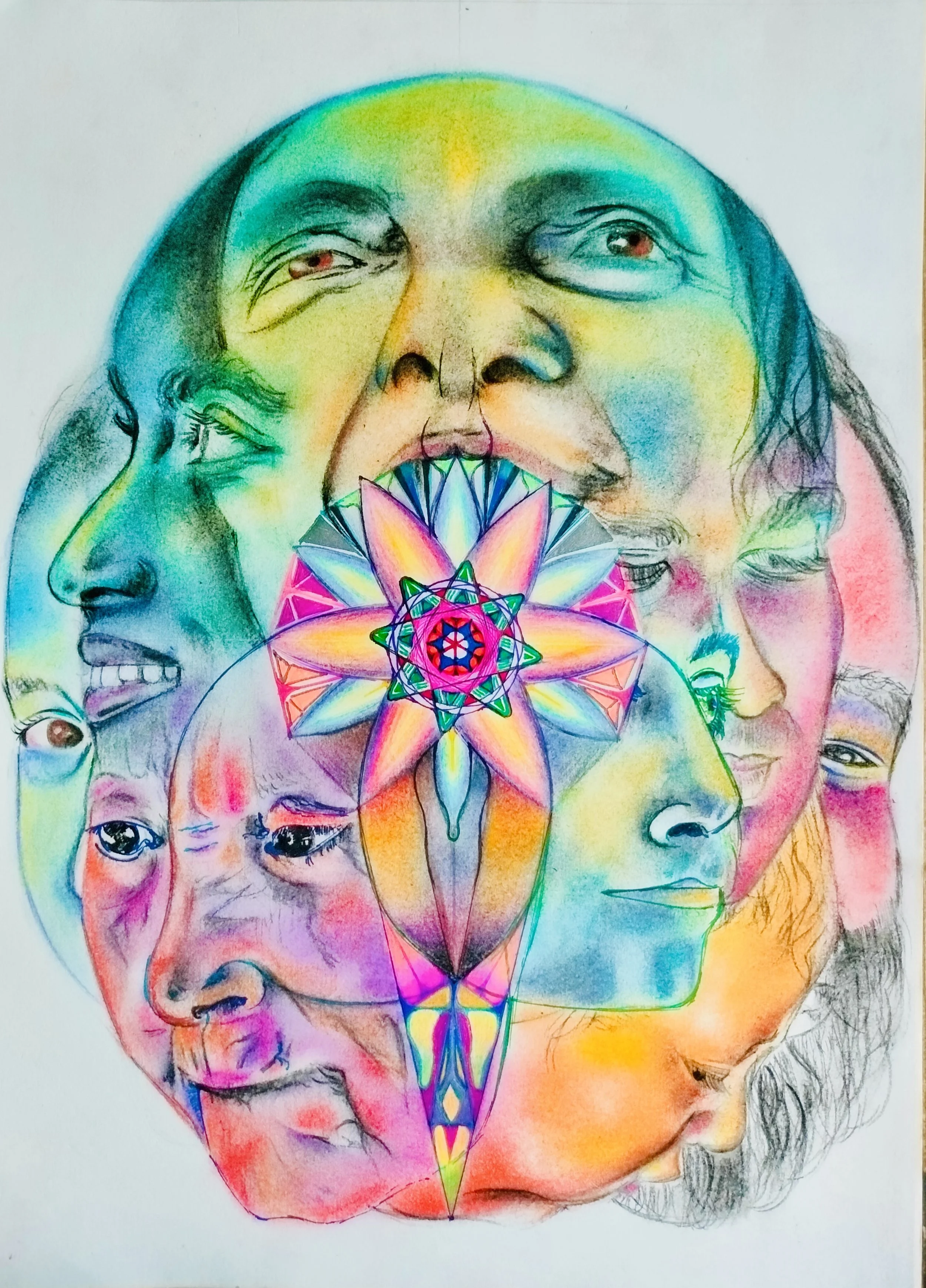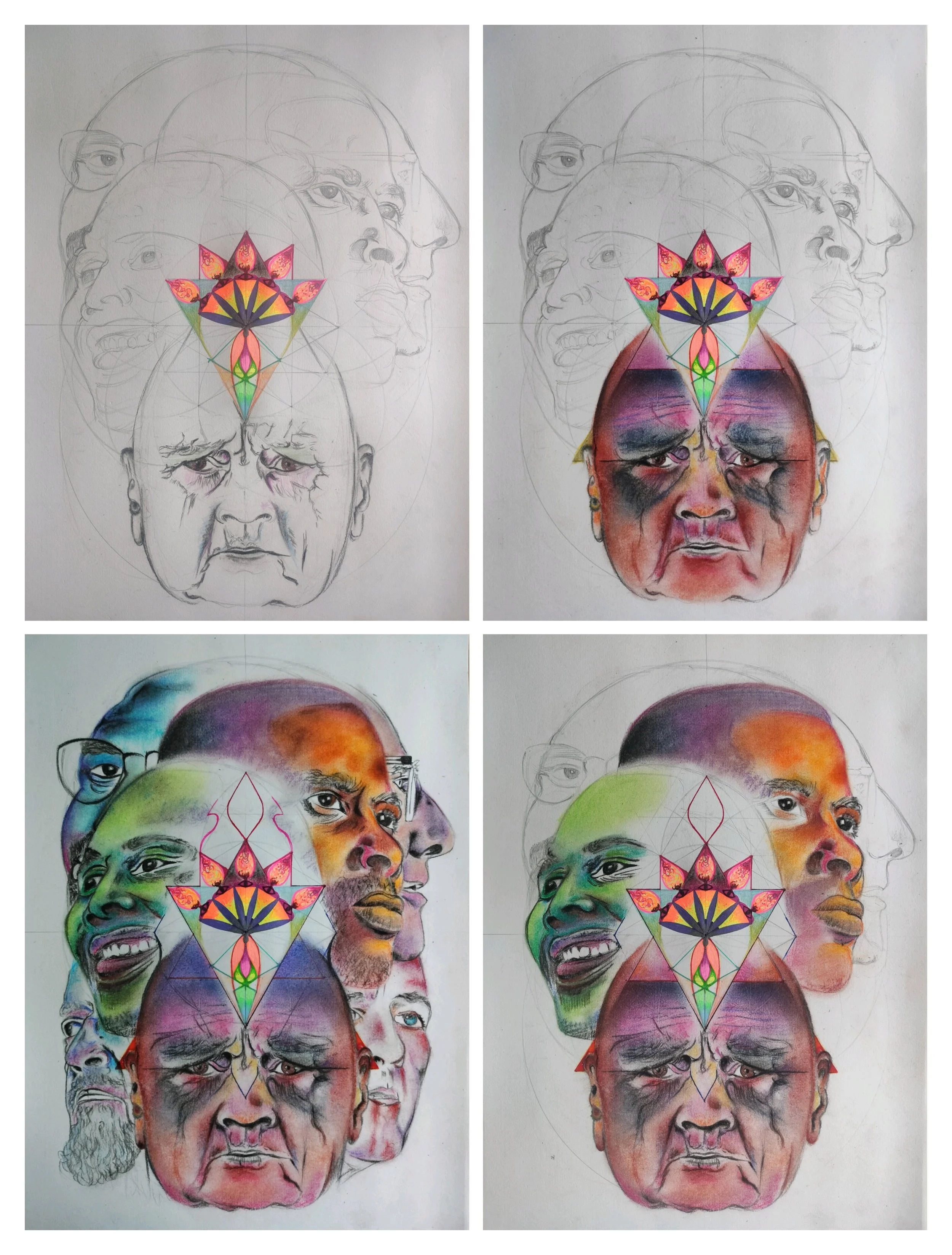 Inspired by visits to the Buddhist caves in India during a time of intense turbulence, this series honors the often eleven (not ten) headed expression of Avalokitesvara, symbolizing his infinite compassion and ability to perceive suffering across all directions.